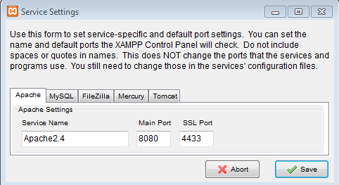 Here you will find Apache Setting under Apache tab like Service name: ApacheX.X, Main port: 80, SSL: 443